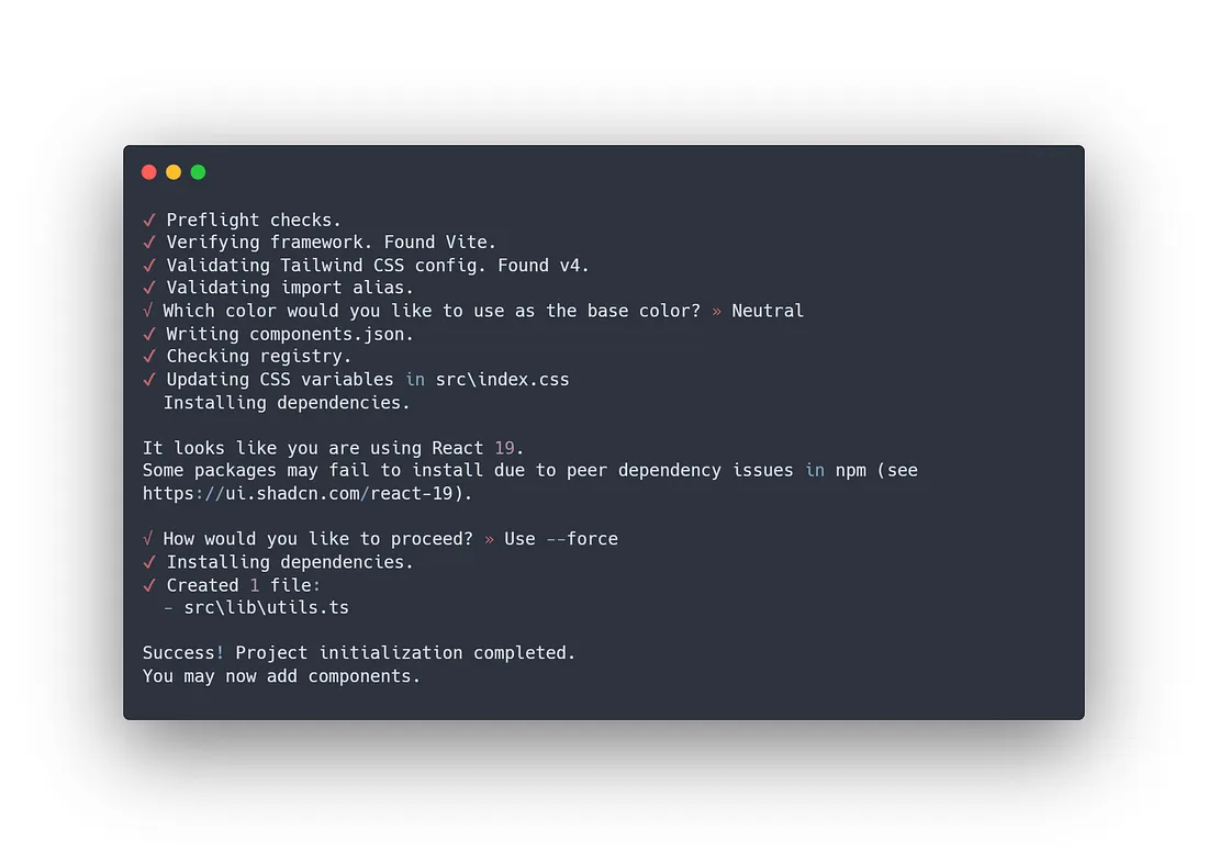 Please note that at the time of updating this article (May 14, 2025), shadcn does not fully support React 19 completely in the stable release, hence the warning in the screenshot above. React 19 support is added in the canary release.