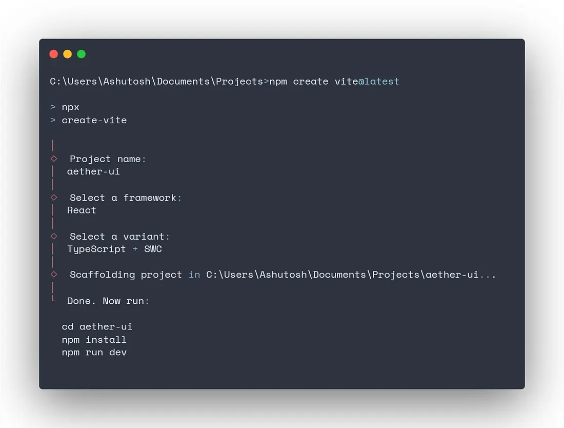 npm create vite@latestFollow the on-screen prompts in the terminal and give your project name. For the purpose of this article we are using the name “aether-ui”. Since we will be using React and TypeScript, select the options accordingly.